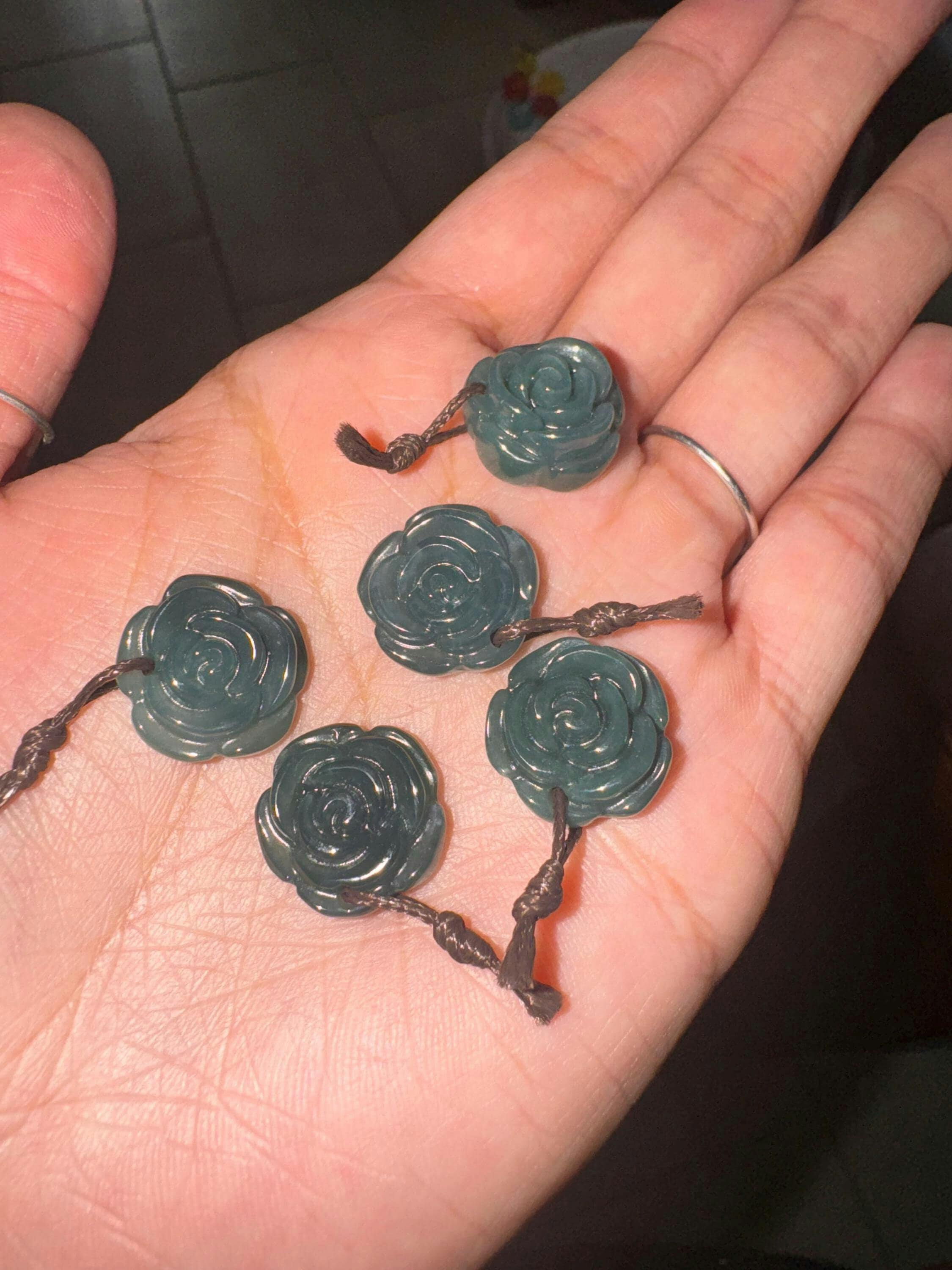 • Hand Carved Natural Dark Blue Green Guatemalan Jade Rose Flower Gemstone Pendant