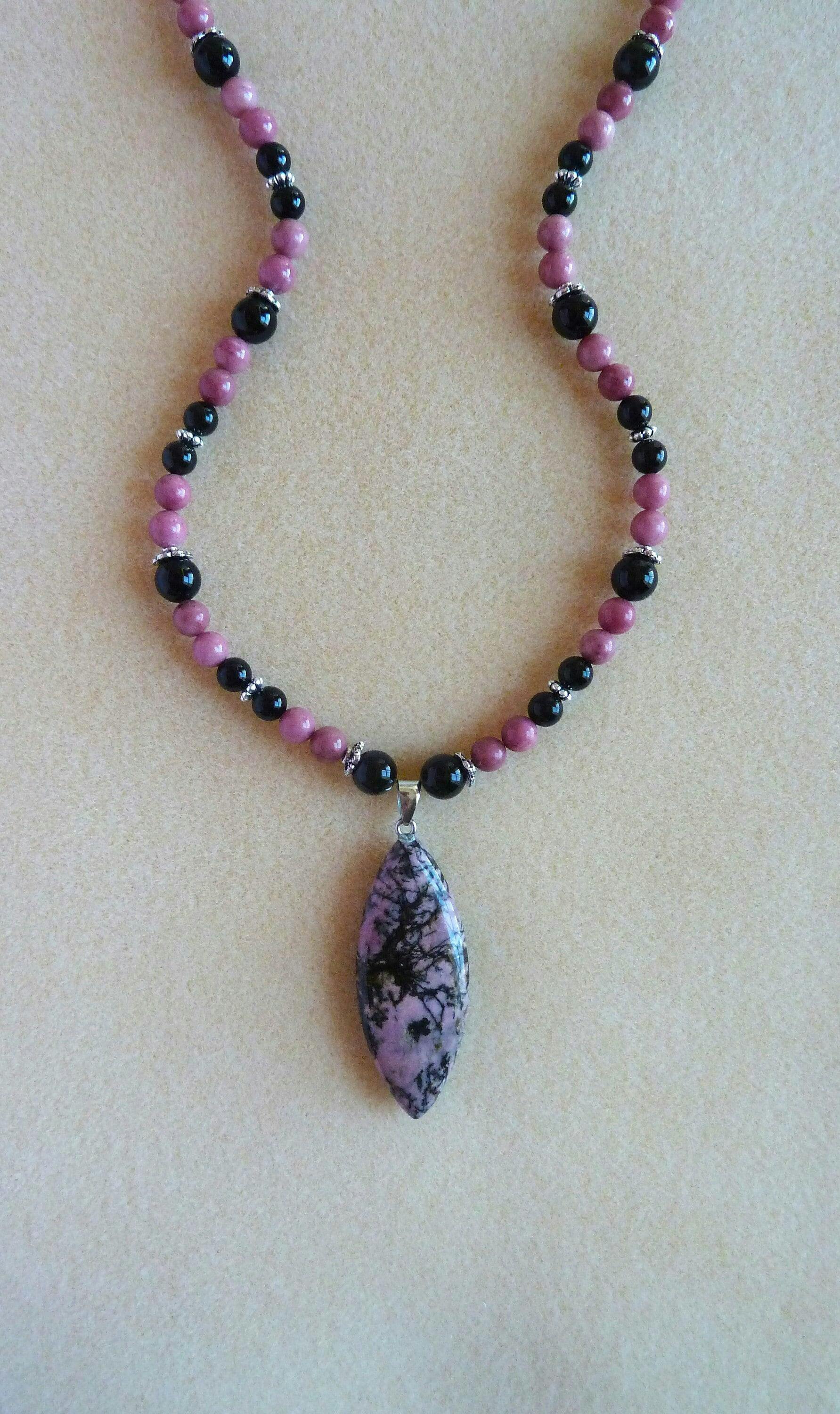 Good quality Rhodonite pendant. Combined with black onyx for a necklace to sell.