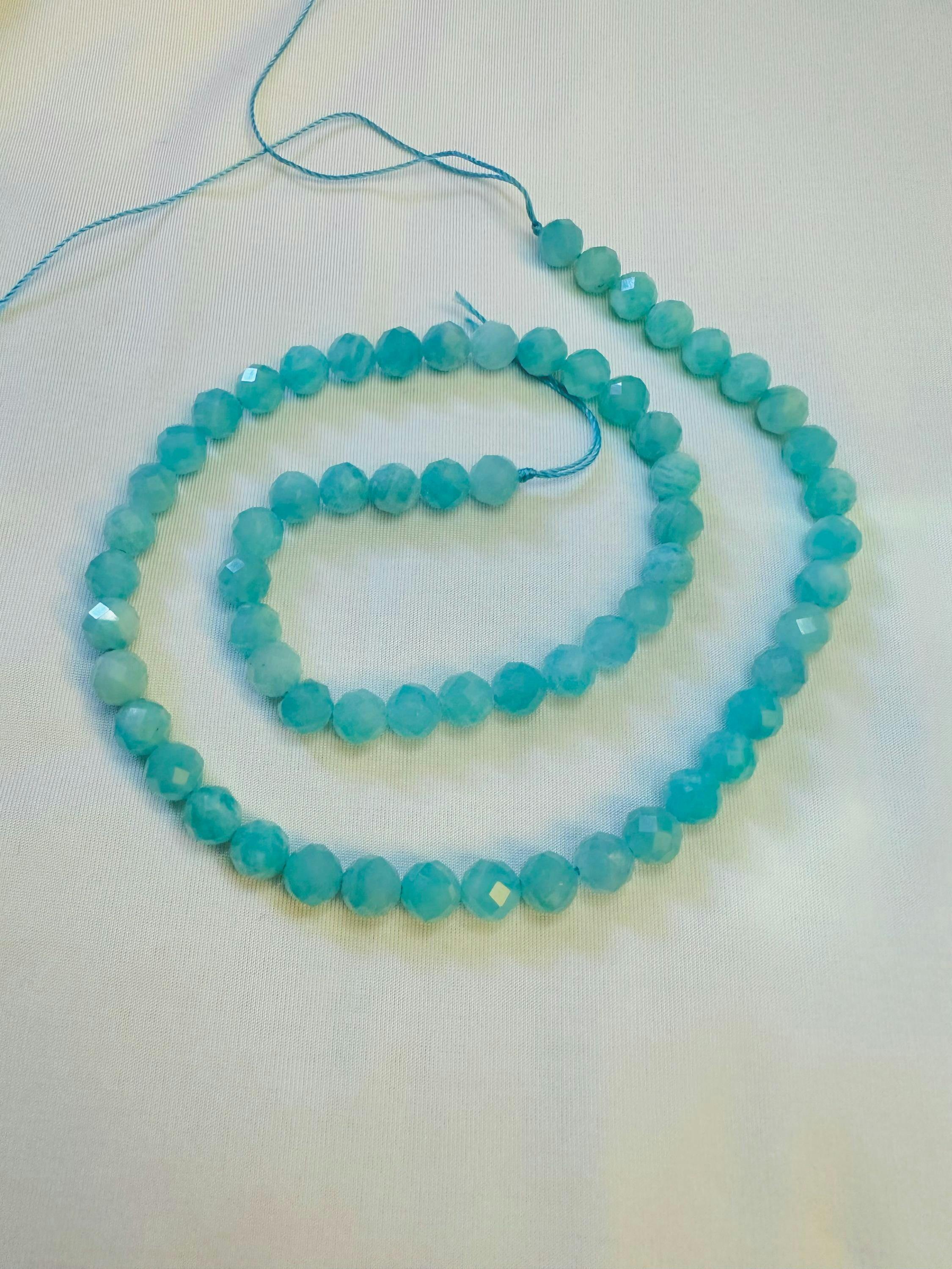 Guaranteed 100% natural Peruvian Amazonite not treated in any way... Superior AAA quality! Stunning vibrant gemmy sea blue green color!... These are simply the best micro faceted natural Peruvian amazonite beads you'll find on the market. They are also perfectly drilled and you will be able to use each and every bead! Thanks to the advanced laser technology, these beads are nicely laser faceted to achieve the dazzling diamond look! Pictures don't do justice to these amazing sparkling gems! Made for Amazonite lovers with discerning eyes who recognize top tier!