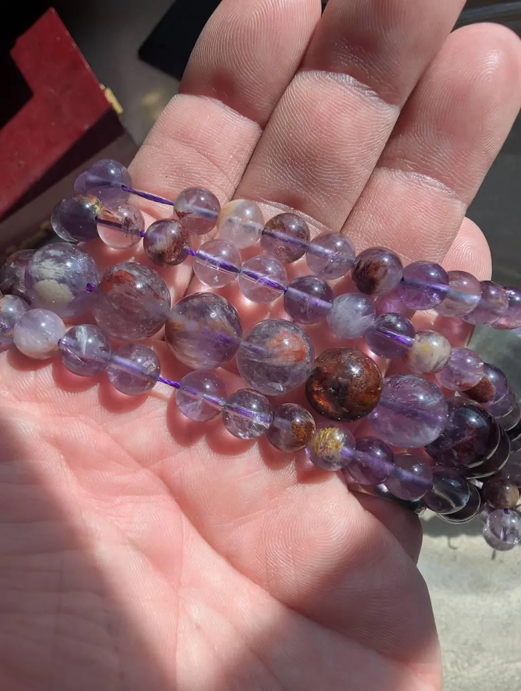 Guaranteed genuine 100% natural phantom amethyst not treated in any way... Superior A grade!... The gorgeous glowing clear purple colors along with the amazing red and brown mineral deposits make these beads some of the most powerful healing stones in the metaphysical world!