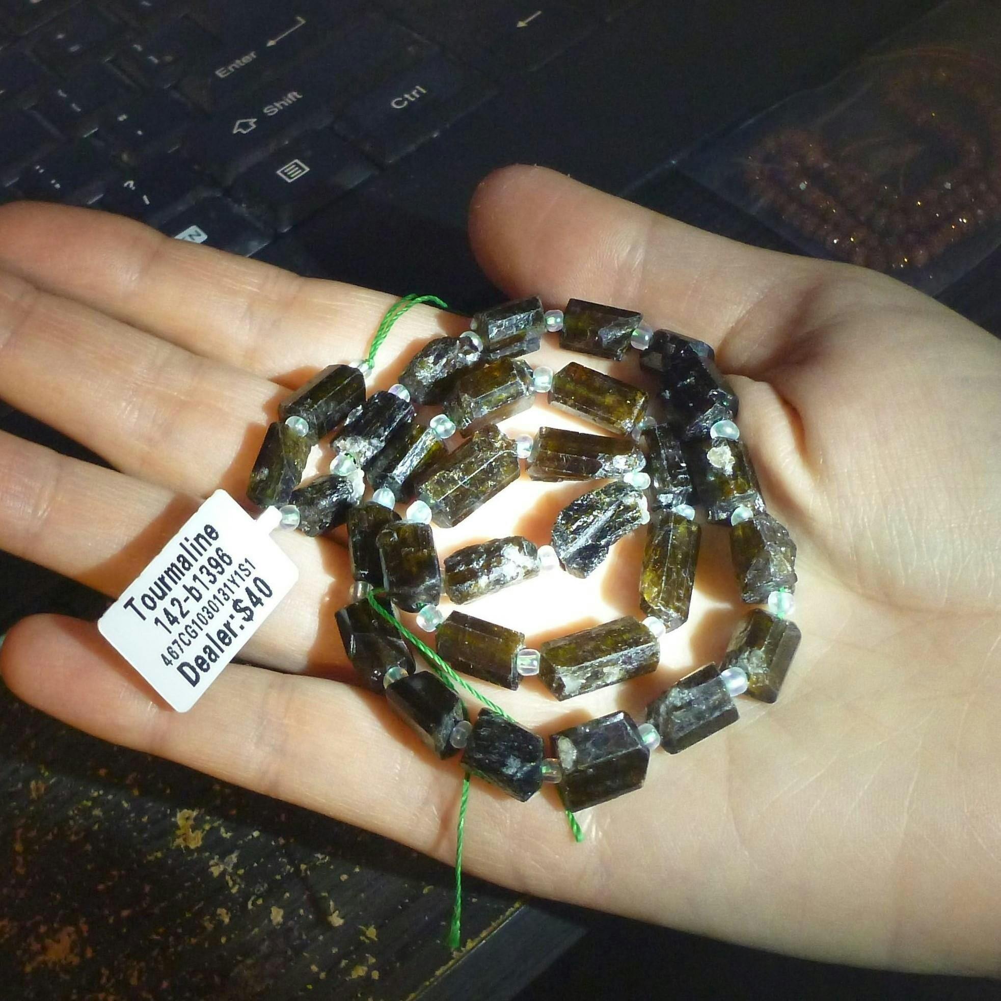 They look like the advertised pictures which does not show any green in the beads even though the descriptions says shades of green....I don't know why sellers do that. Maybe they used to have strands with hints of green. Anyway, It is important to know that ALL of the beads will be dark so they will all look black unless light is shining on them. I knew this from another review before purchase so I was not disappointed that all were the same dark color.