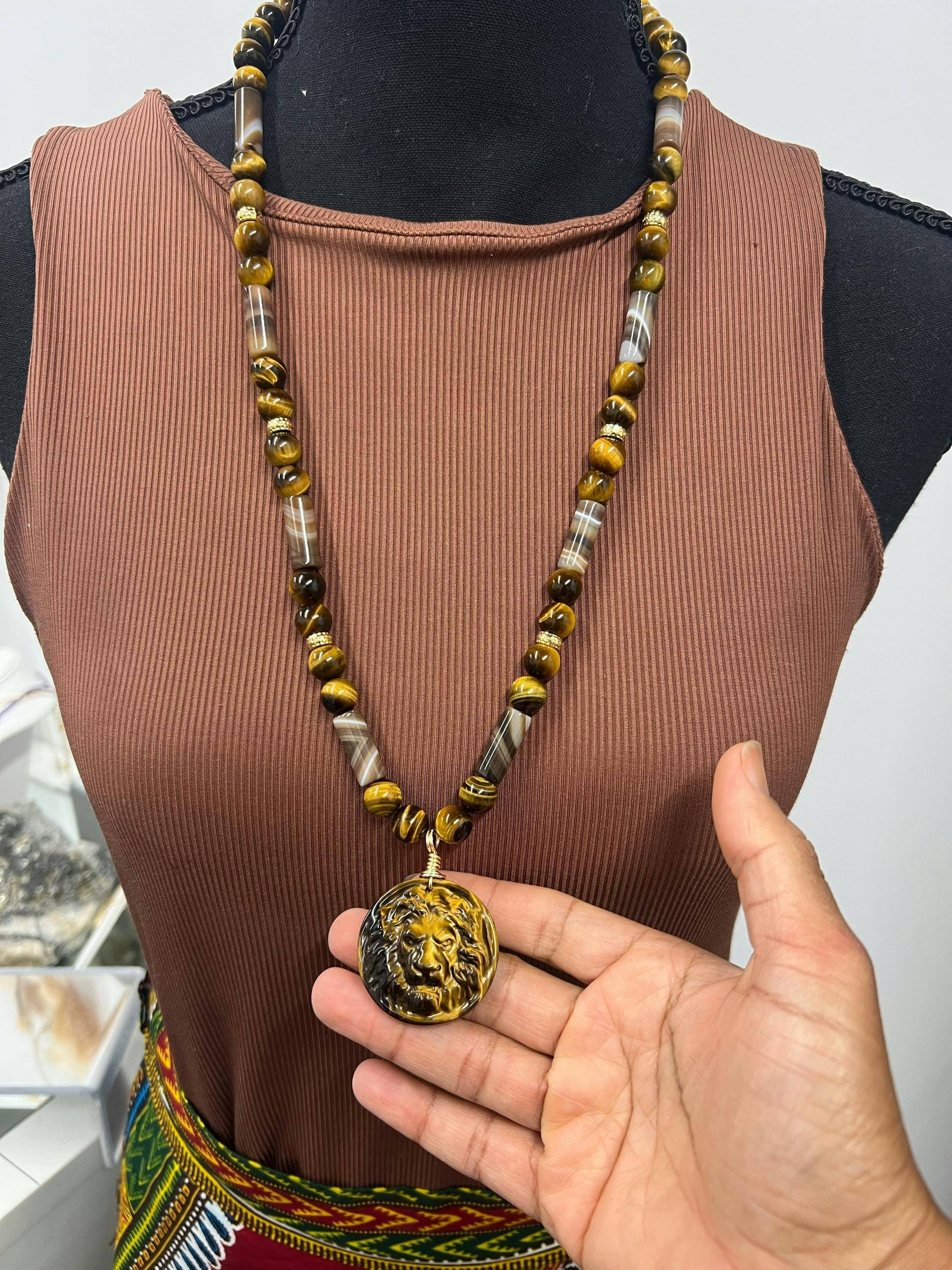 Guaranteed 100% natural tiger's eye not treated in any way... Expertly hand carved and exclusively made for us... Not seen anywhere else! Unleash your inner power with this stunning Tiger’s Eye lion head pendant, meticulously hand-carved into a round medallion. The detailed lion face symbolizes courage, strength, and leadership, while the natural golden shimmer of Tiger’s Eye adds a bold and regal look.