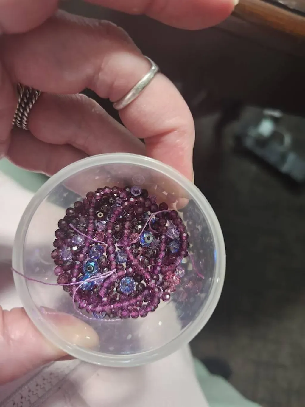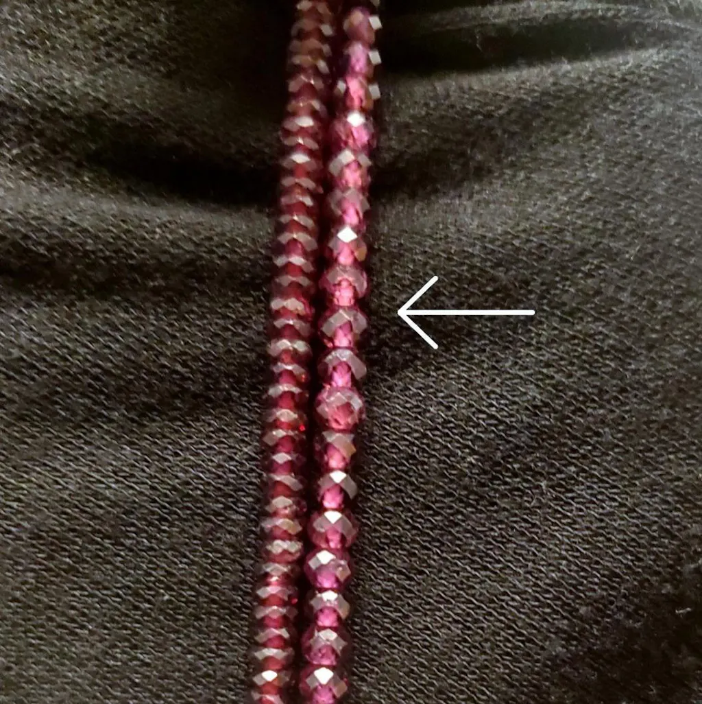 Very sparkly (4 mm) raspberry purple garnet rondelle beads with great clarity, shown here side by side with the slimmer 4 mm purple garnet rondelles sold by this same vendor. This thicker rondelle strand appears a bit less saturated in color than the thinner strand but shows a good bit more of the purple tone. They both are gorgeous and look good enough to eat!