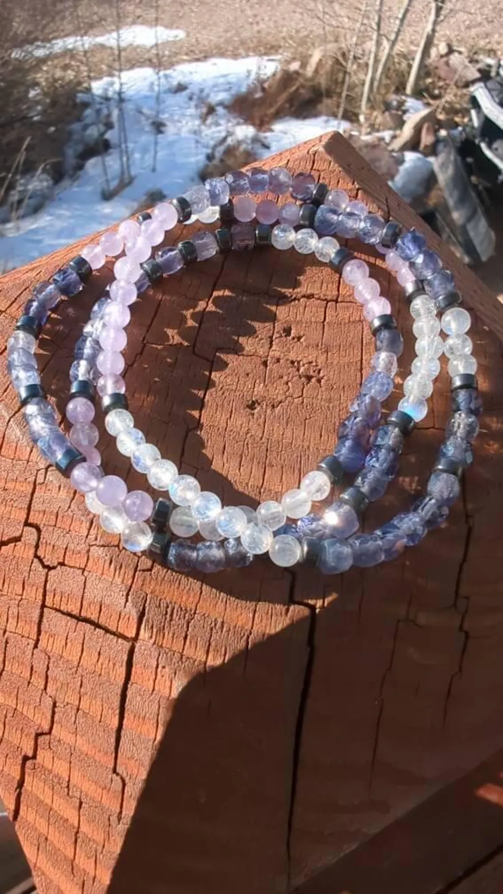 I really like the more pink color on this amethyst. It definitely looks pink to pale purple. It is next to moonstone and lolite in this picture.