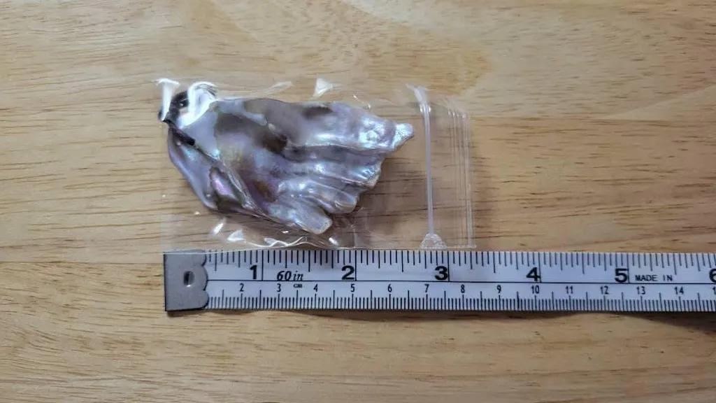 The shop owner was nice enough to send me a wing pearl with the drill hole at the base of the “wing,” just as I asked for. Much appreciated. I love the pearl. It is huge, and it will make a wonderful pendant.